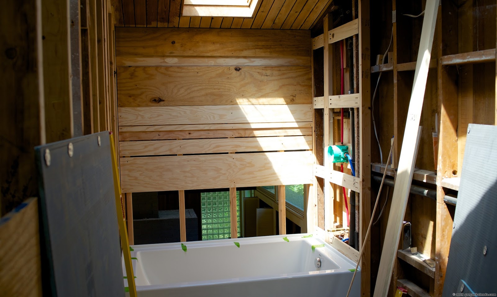 | The tub is set, leveled, glued and back filled with foam underneath. All that plywood is various sized shims to level out the back of the tub. |