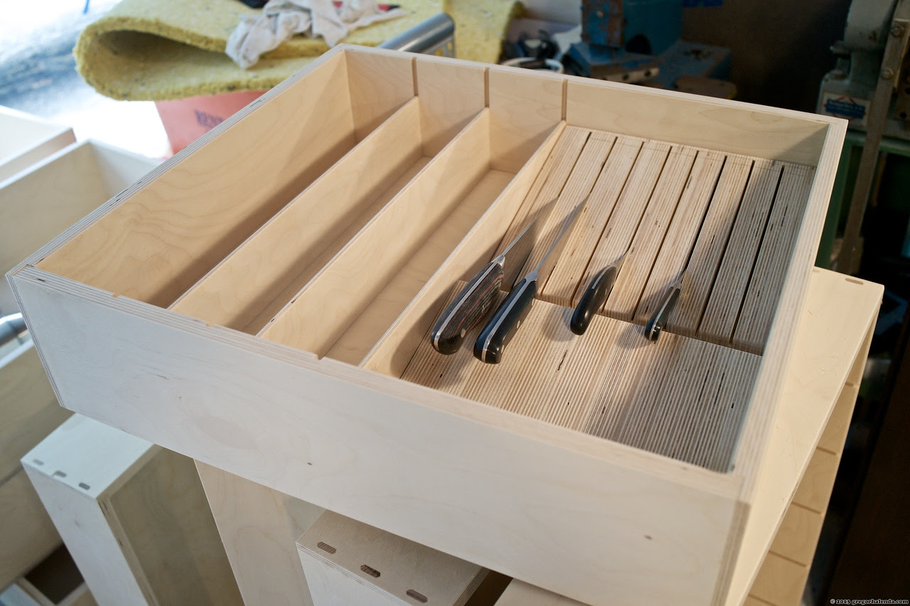 I also wanted the top drawers to hold all the normal utensils that would sit on the counter in crocks or such and so the drawers needed to be a bit deeper but also have dividers. For instance the knife drawer is deep enough that a cutting board can sit on top of the knives and such and be out of the way.